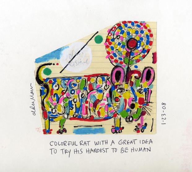 Colorful Rat With a Great Idea 2008. 7 3/4 x 10 1/2" enamel pen, whiteout, sharpie and pencil on lined paper